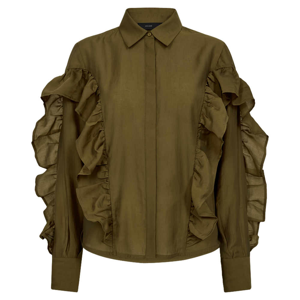 Copenhagen Muse Molly Blouse Military Olive heeft een blinde knoopsluiting, een kraag en prachtige details op de mouwen.