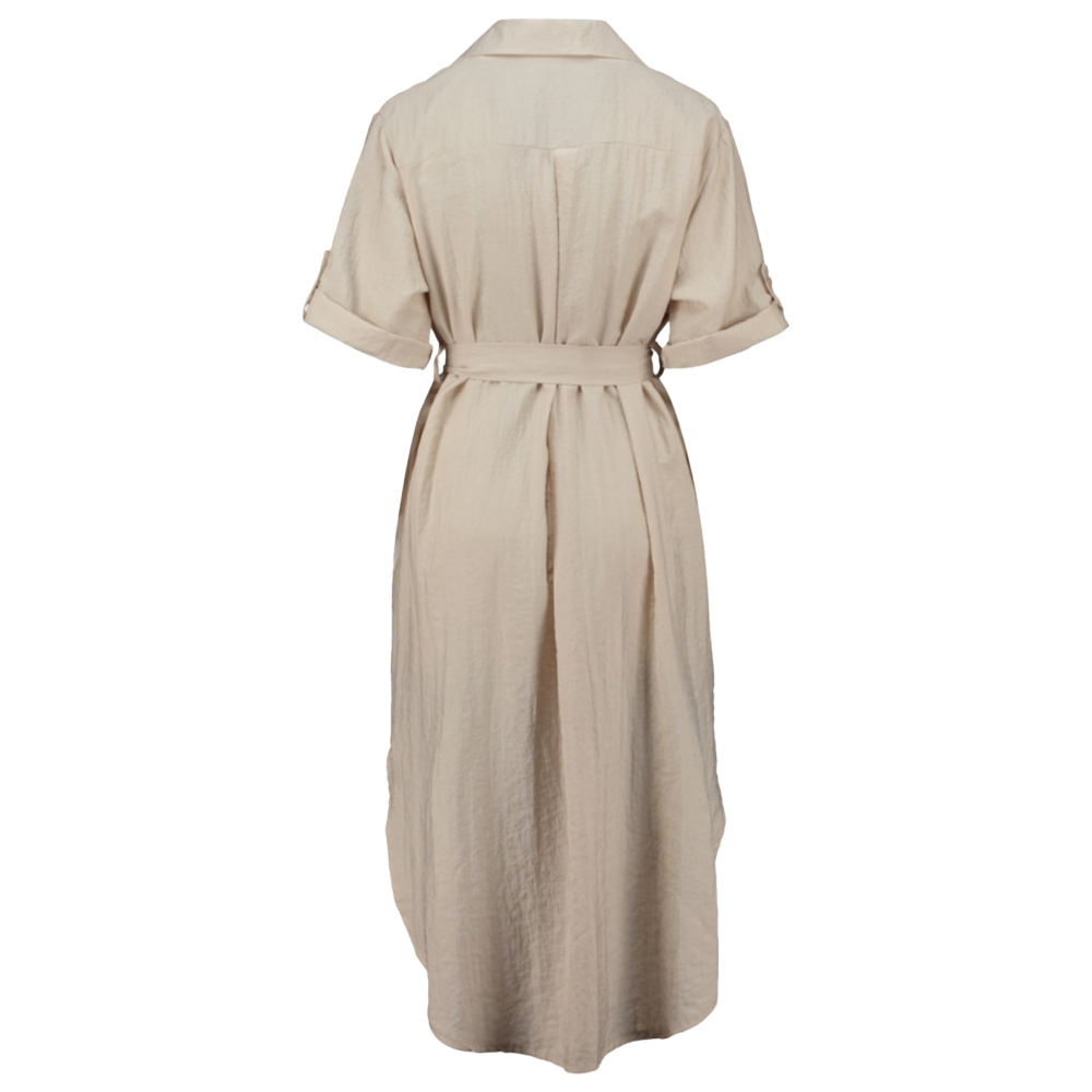Dress za Lara beige is een middellange jurk met knopen over de gehele lengte, korte mouwen, een kraag en heeft een bijpassend ceintuur.