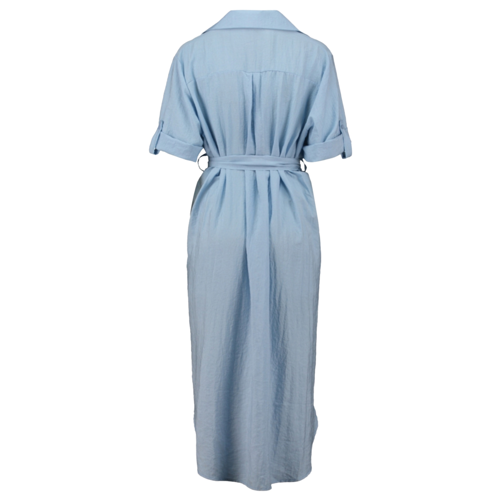 Dress za Lara light blue is een middellange jurk met knopen over de gehele lengte, korte mouwen, een kraag en heeft een bijpassend ceintuur.