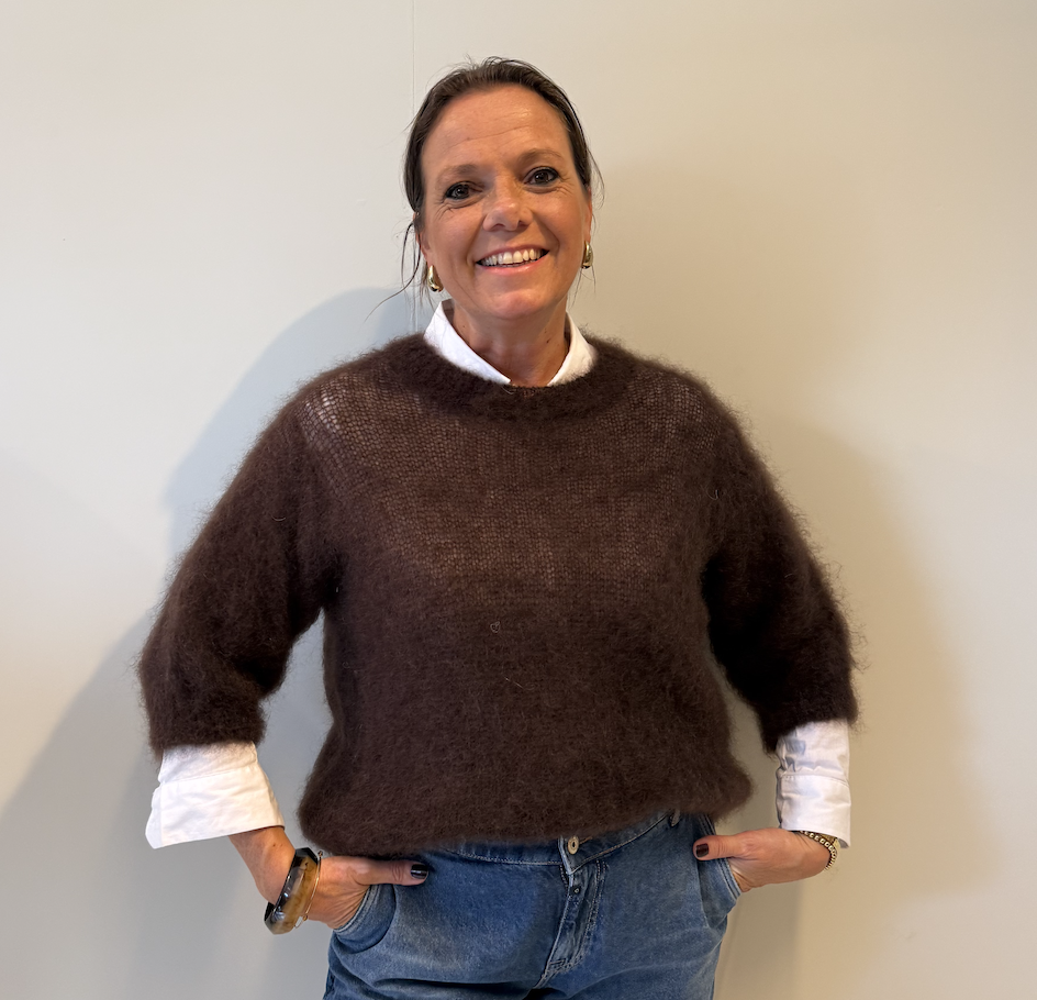 Kid Mohair Pull Feline dark brown heeft een ronde hals en een drie kwart mouw. De trui is one size.