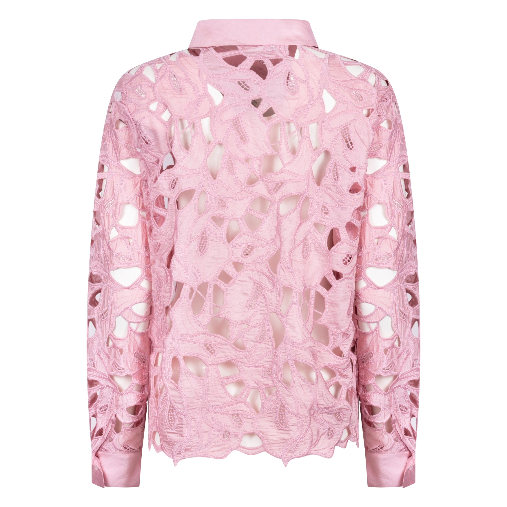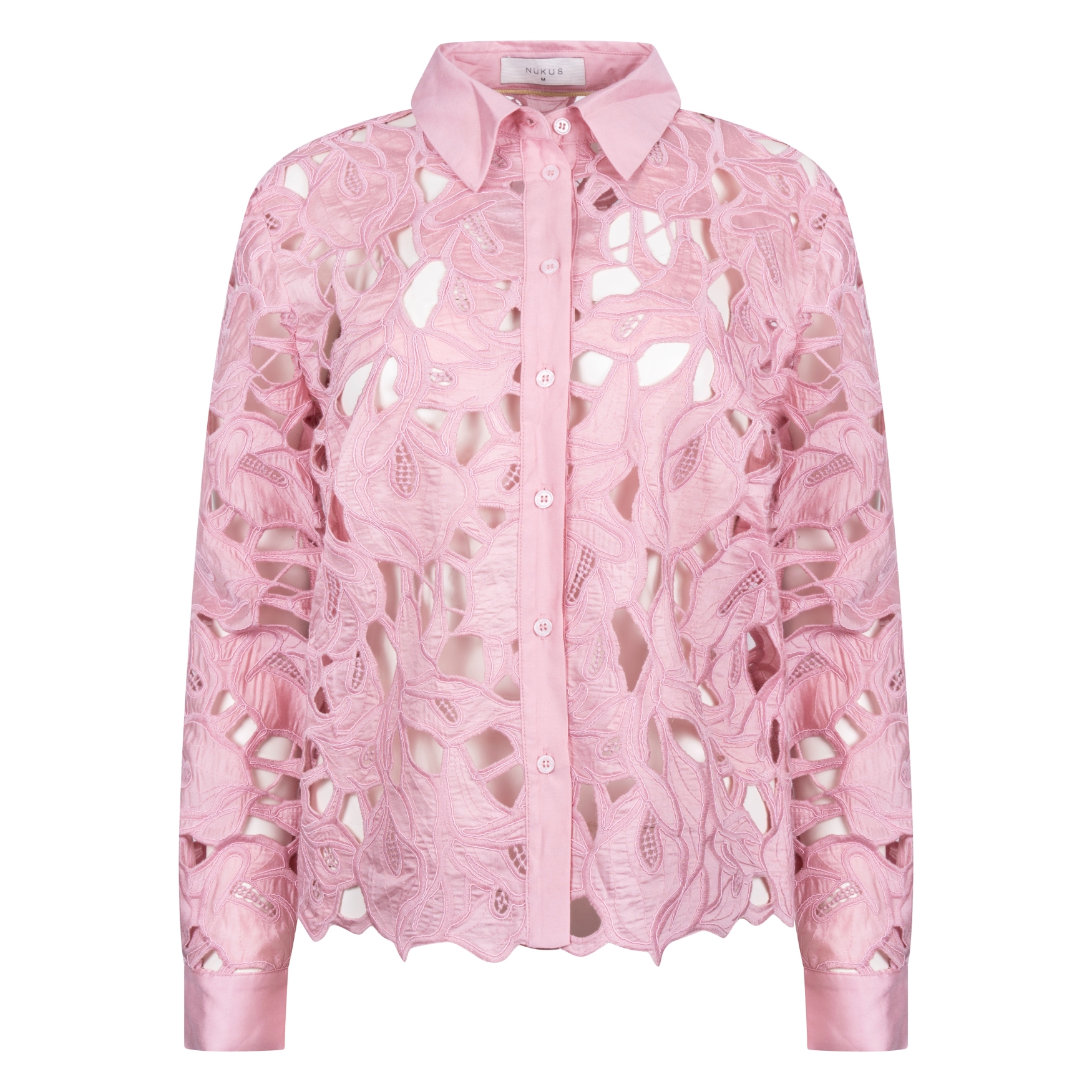 Nukus Chloe Blouse Flower Blush is een prachtig opengewerkte blouse, met lange mouwen, knopen over de gehele lengte en een kraagje.