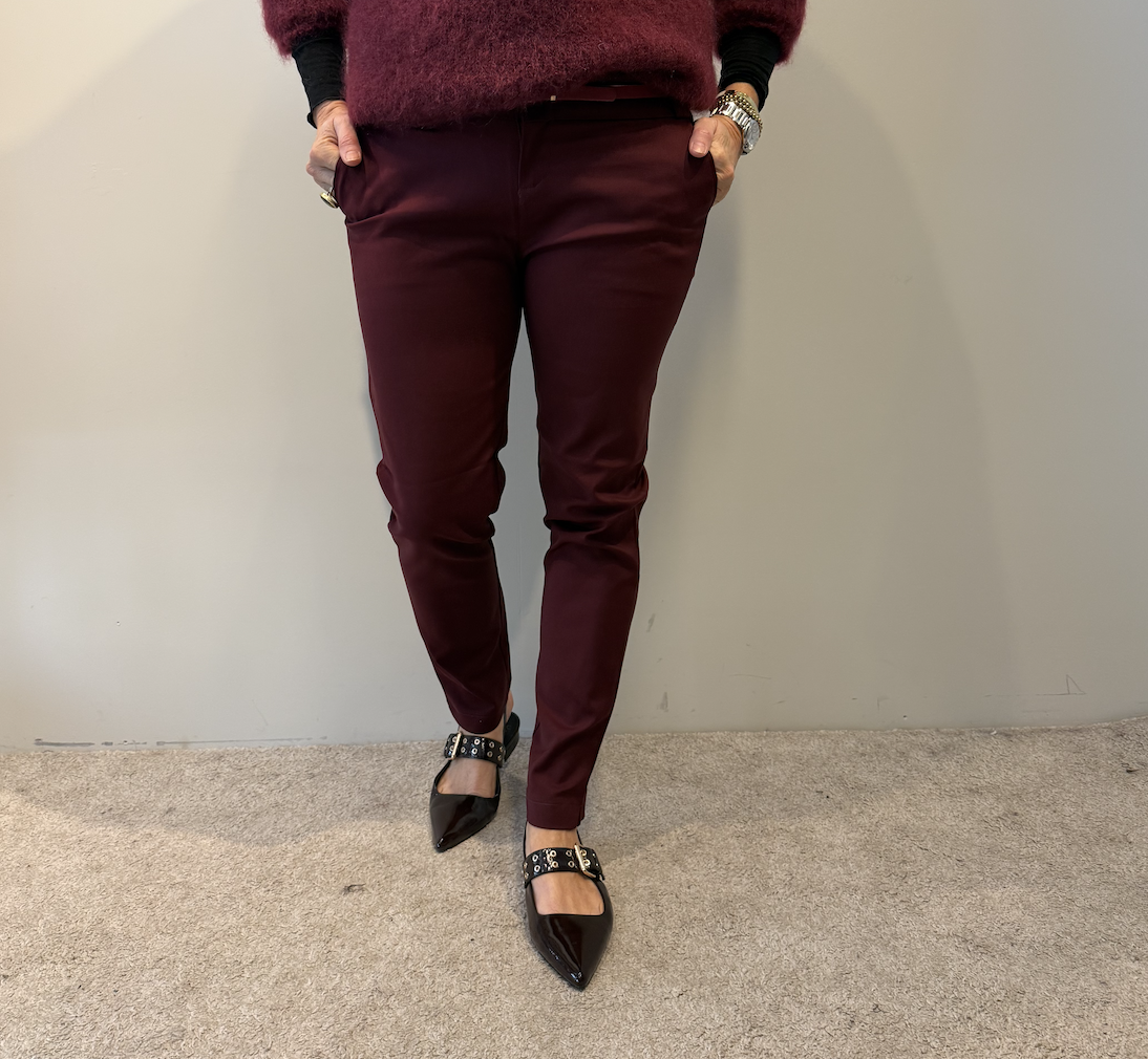 Pant Romy bordeaux is een chino pantalon met insteekzakken, stretch en een bijpassende riem. Verkrijgbaar in meerdere kleuren.