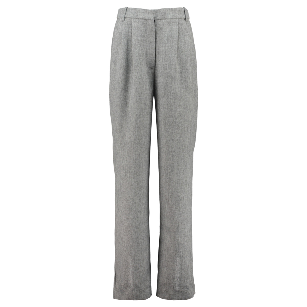 Pants za Leyla grey heeft wijde broekspijpen, riemlussen voor een ceintuur en een rits- en knoopsluiting. Let op: de broek valt klein.