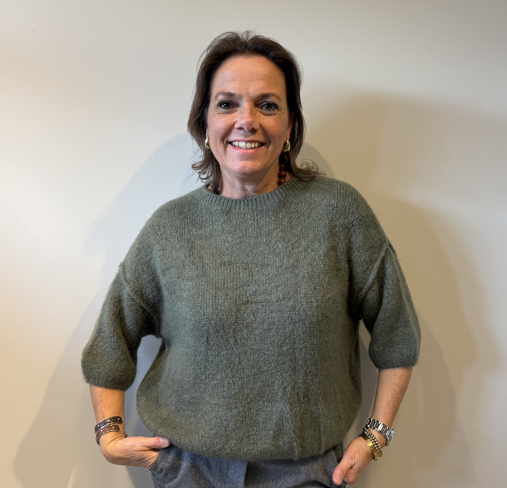 Pull Dianne olive heeft een korte mouw, een ronde hals en is one size. Verkrijgbaar in meerdere kleuren.