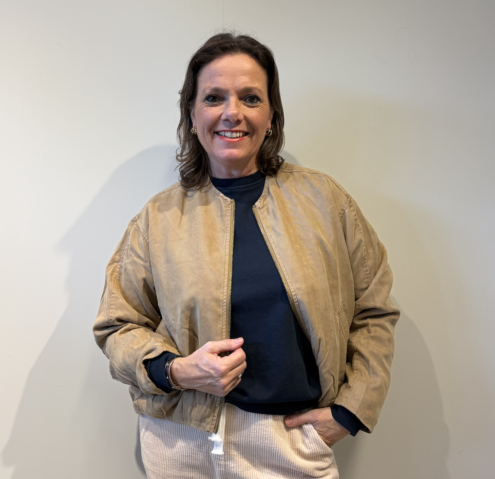 Senses The Label Jacket light cognac heeft een ritssluiting aan de voorkant, lange mouwen en het logo op de achterkant.