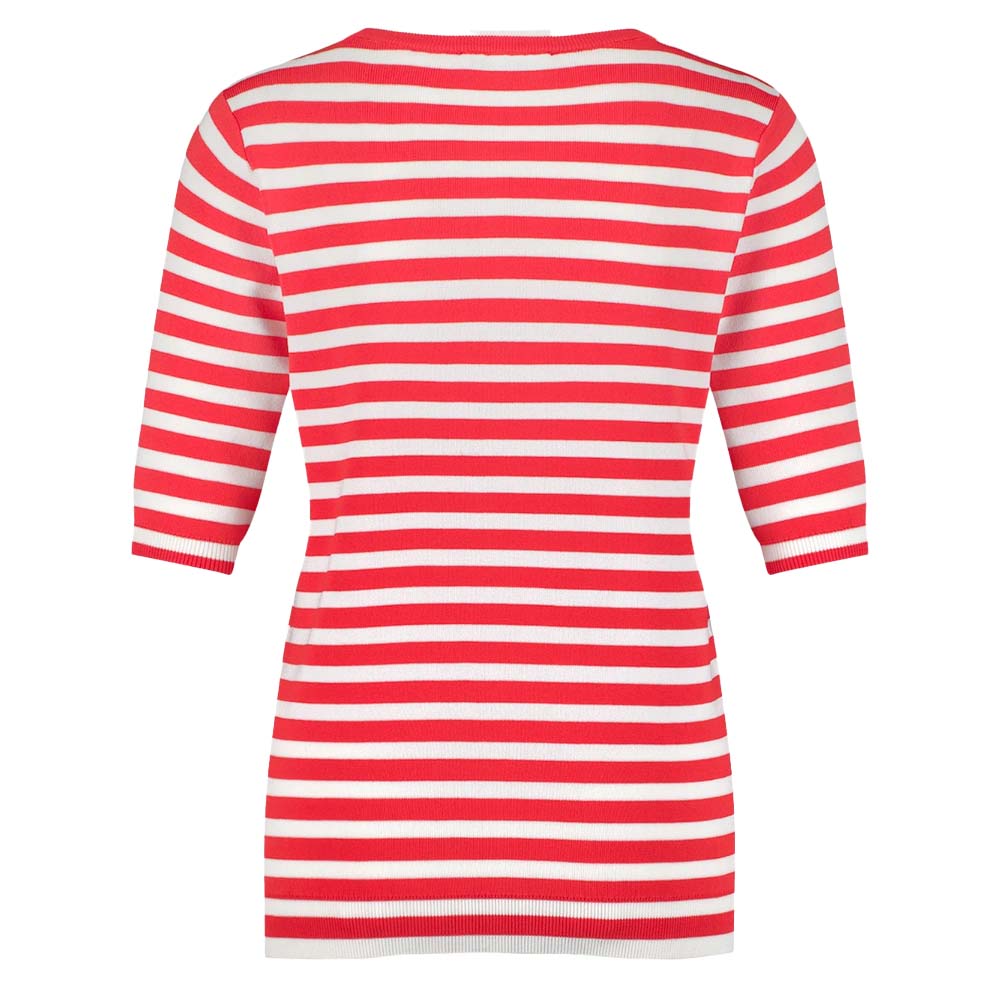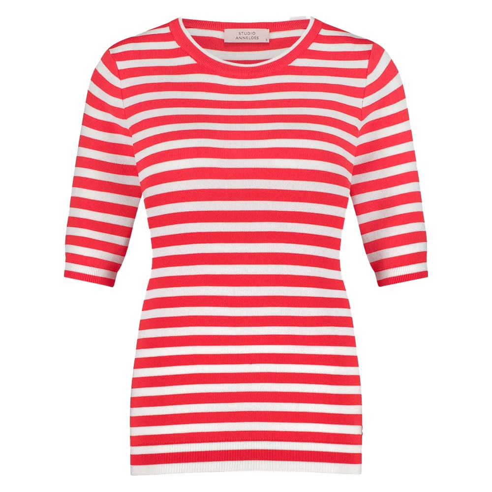 Studio Anneloes Luna stripe sl pullover coral red/offwhiteheeft korte mouwen, een ronde hals, een travel knit. Verkrijgbaar in meerdere kleuren.
