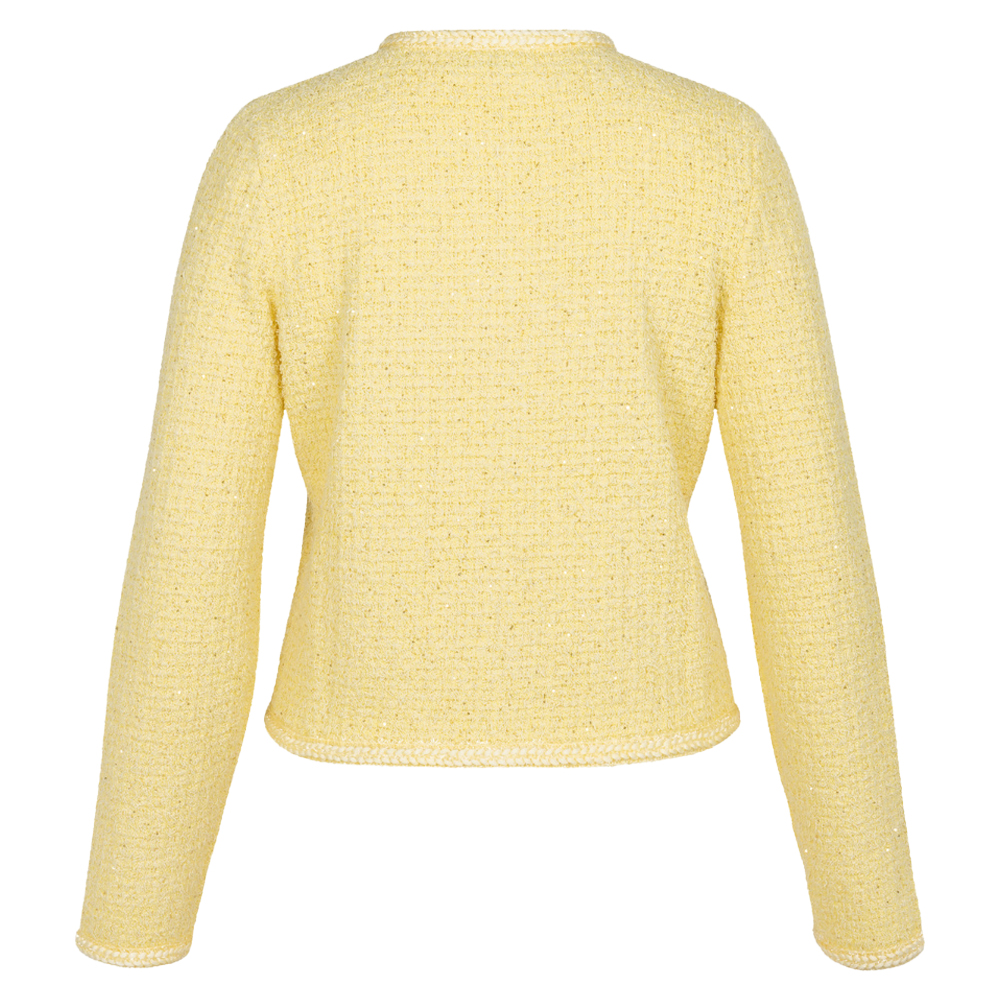 Studio Anneloes Xana Tweed Cardigan butter yellow heeft een subtiele glitter. Het vestje heeft een rijke knit structuur, lange mouwen, een ronde hals.
